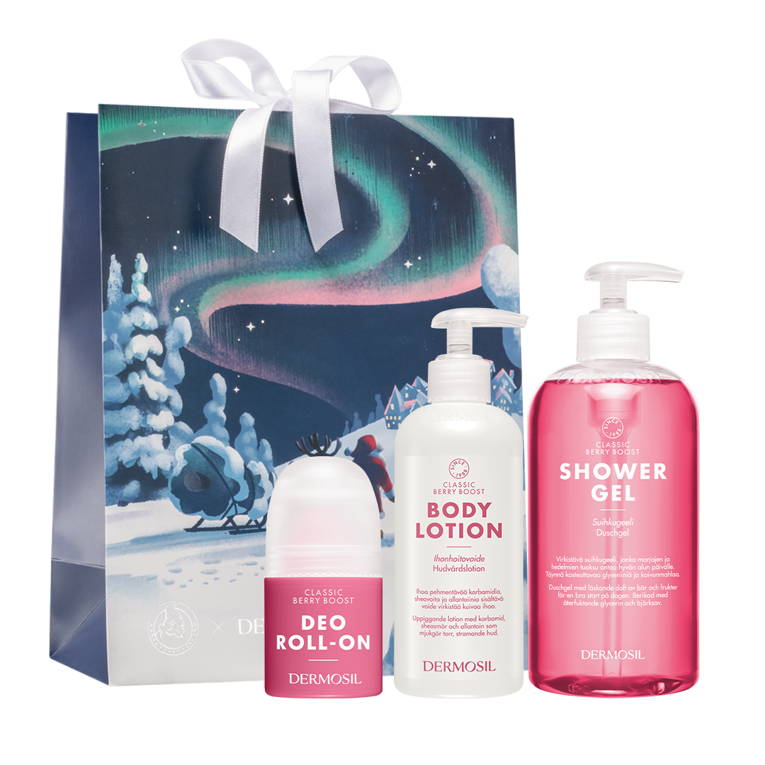 Kinkekomplekt Marjadessert sisaldab kolme värskendavat toodet kehahoolduseks. Sarja Berry Boost dušigeel, deodorant ja ihupiim toovad oivalise marjalõhnaga pimedasse talve veidi rõõmu.
