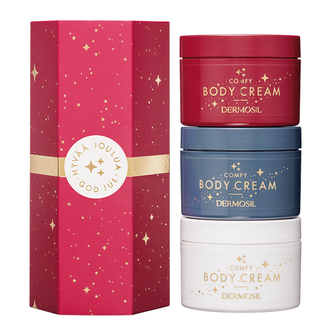 Kingipakk Comfy on suurepärane nahahoolduse kinkekomplekt, mis sisaldab kolme taevalikult pehmet ja täiuslikult luksuslikku kehakreemi kuiva naha hellitamiseks.