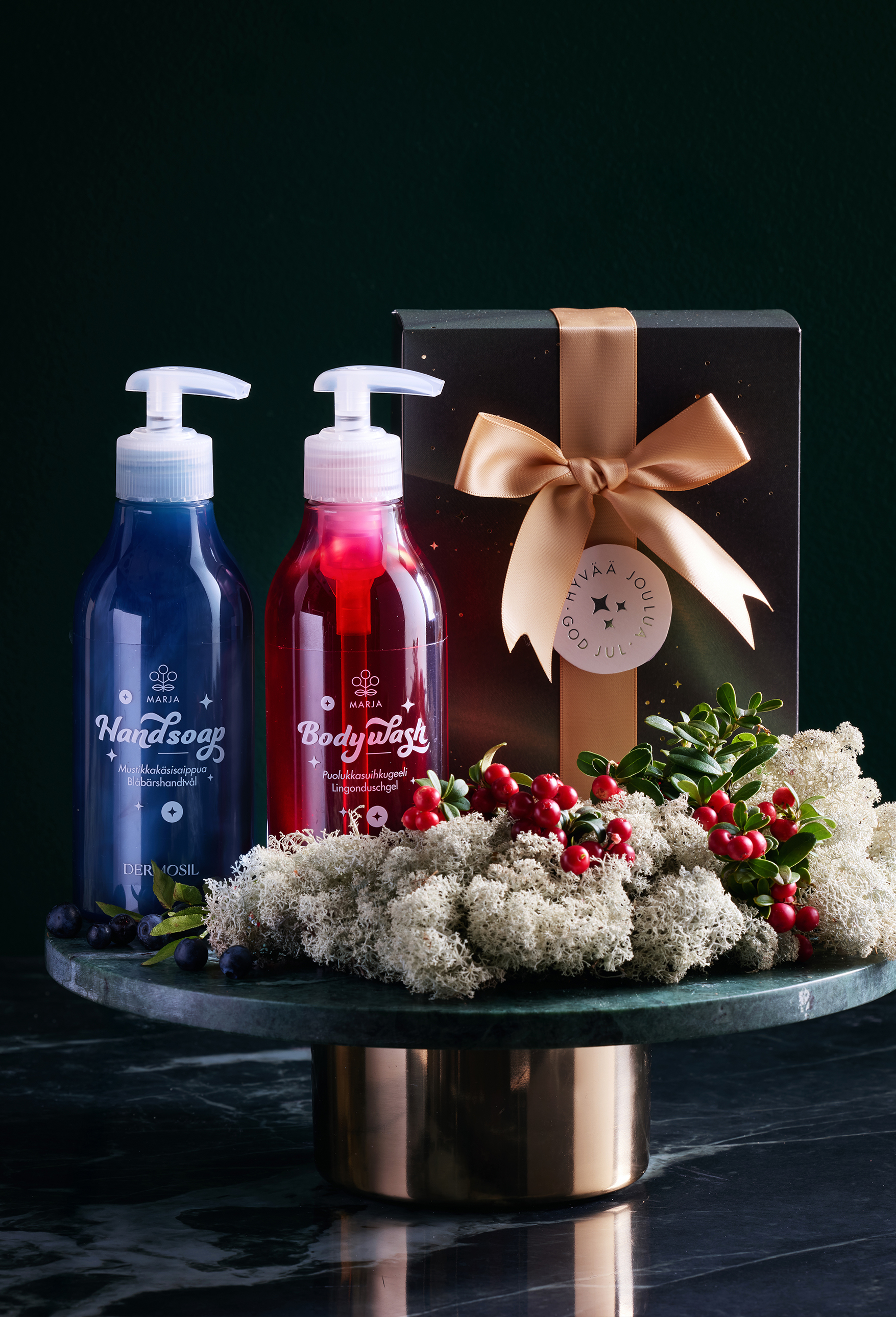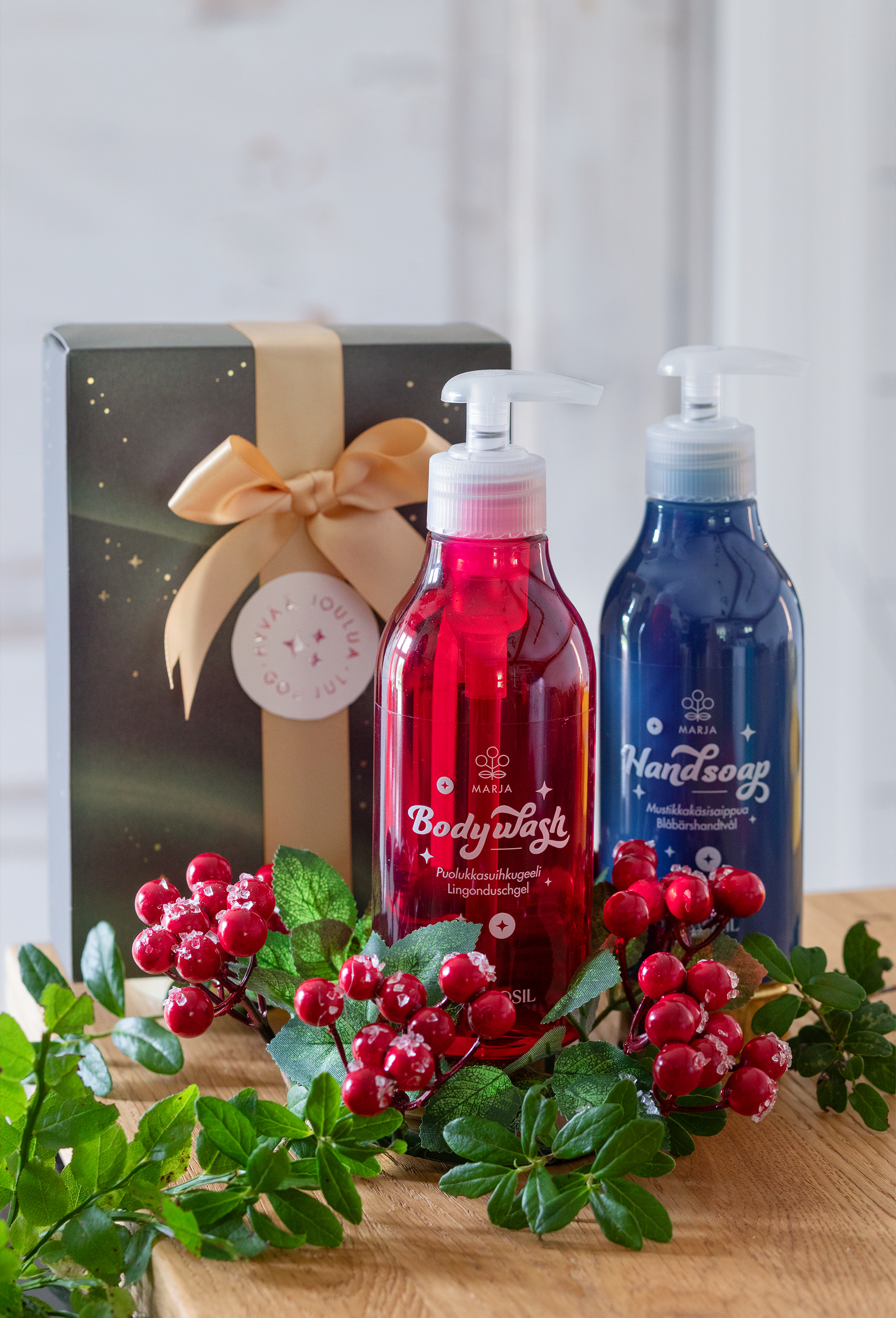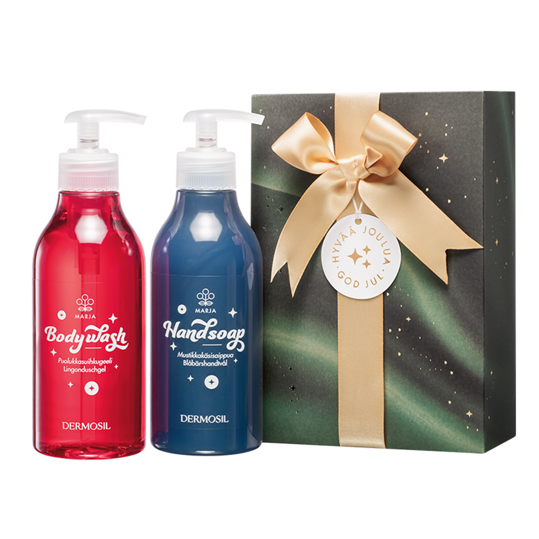 Kingipakis Berry on peidus Soome metsade marja-aarded – Dušigeel Pohl ja Käteseep Mustikas. Mahlaselt marjased tooted on valmistatud meie enda Soome tehases ning pudelitesse villitud luksuslikus koostises on rikkalikult ehtsat mustika- ja pohlaseemneõli.