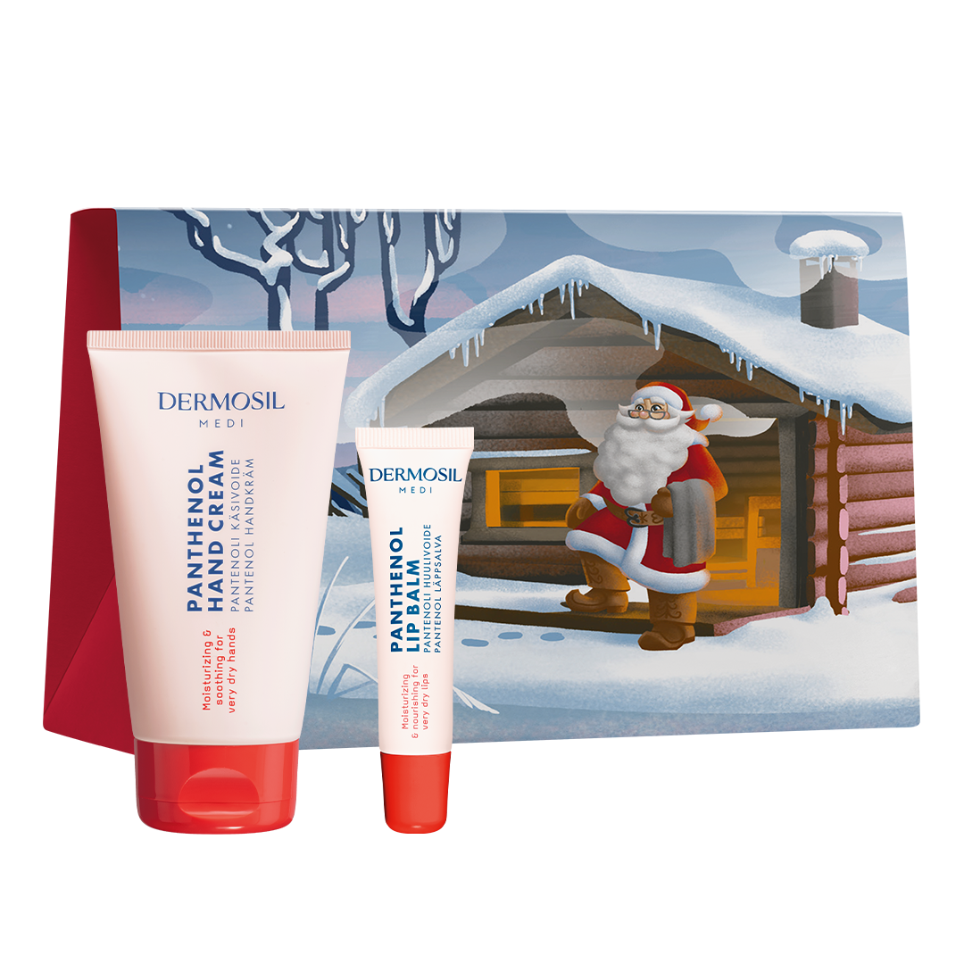 Kosmeetika kinkekomplekt, milles on Pantenooliga kätekreem ja Pantenooliga huulepalsam talviselt kuiva ja ärritunud naha hoolduseks.