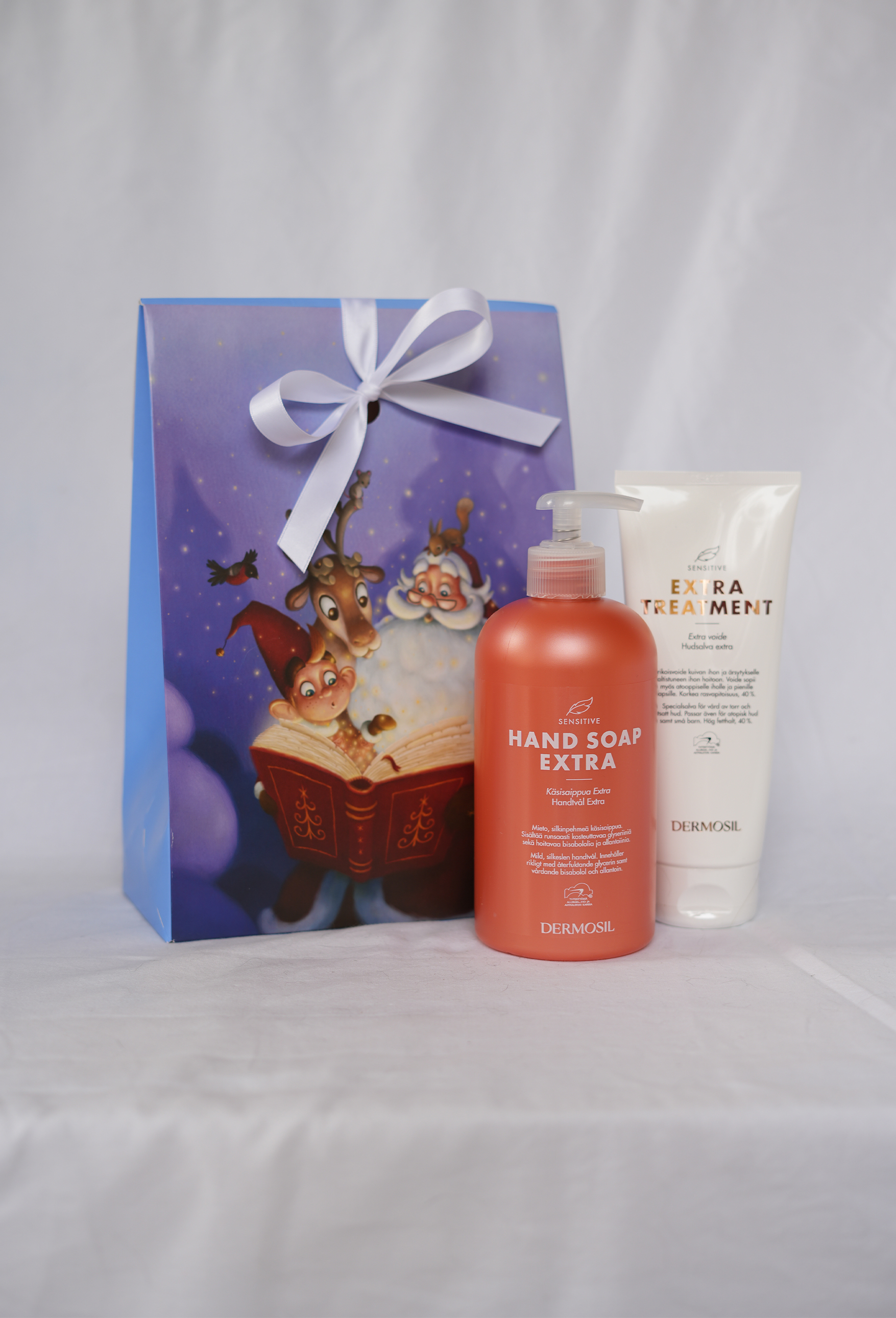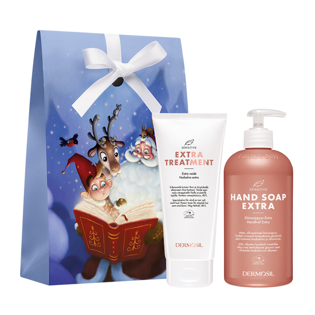 Kinkekomplekt Sensitive Extra on eriti hea valik, kui kingisaajal on tundlik, kuiv või atoopiline nahk. Dermosili tootevaliku armastatud Extra tooted – Käteseep Extra ja Sensitive Extra Kreem – on populaarsed ja usaldusväärsed tooted kogu perele.