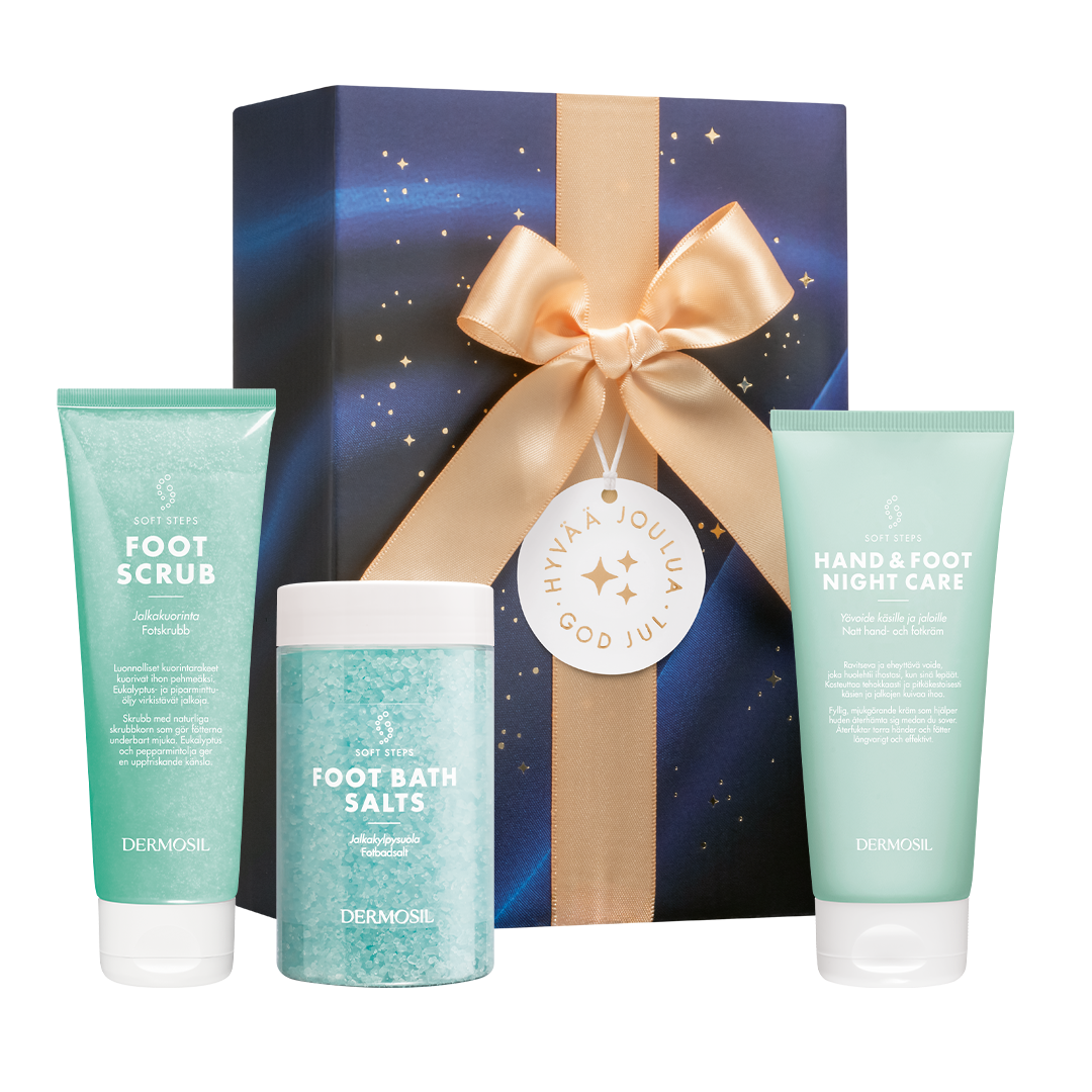 Kinkekomplekt Soft Steps sisaldab tootevaliku kolme populaarset jalahooldustoodet: Jalavannisoola, Jalakoorijat ning Öökreemi kätele ja jalgadele. Nende toodetega teed tõhusa ja lõõgastava koduse jalahoolduse. Komplektis varem olnud kinkepakend on asendatud uue kinkekarbiga.