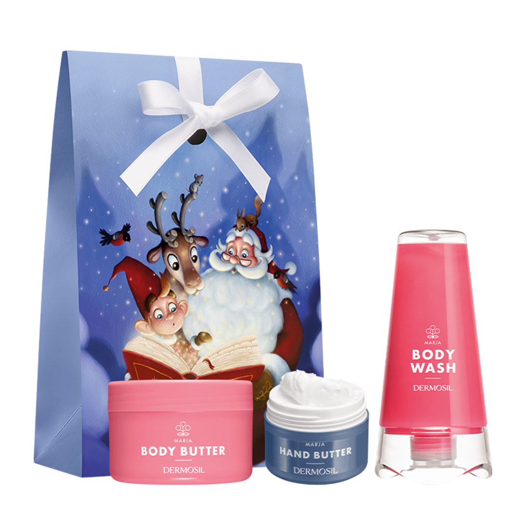 Kinkekomplekt Marjatrio sisaldab tootevaliku tooteid: kahte hõrku vaarikatoodet – Dušigeeli Vaarikas ja Kehavõid Vaarikas – ning imehead Kätekreemi Mustikas. Toodete koostises olevad ehtsate marjade seemneõlid teevad selle nahahoolduskingituse täiesti vastupandamatuks! Komplektis varem olnud kinkepakend on asendatud uue kinkekarbiga.