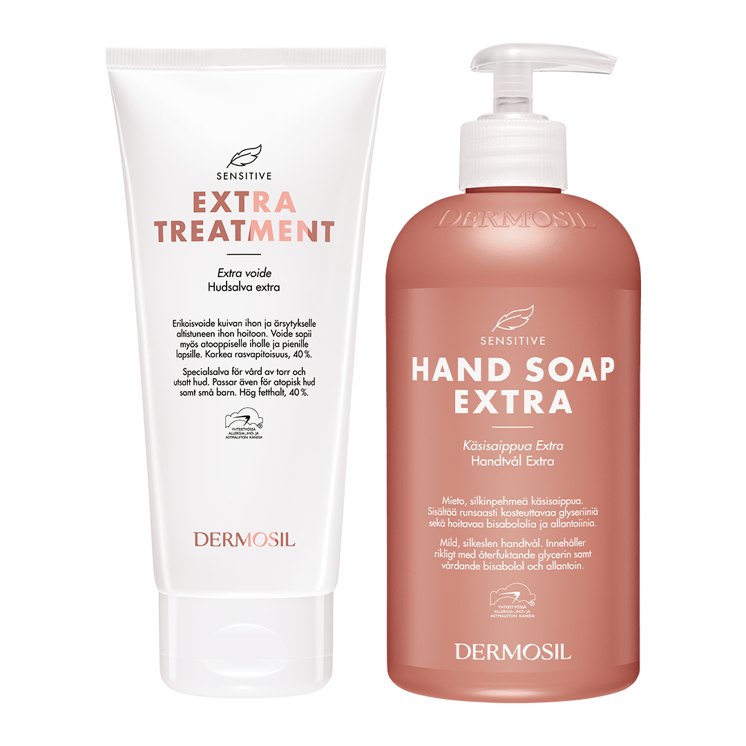 Kinkekomplekt Sensitive Extra on eriti hea valik, kui kingisaajal on tundlik, kuiv või atoopiline nahk. Dermosili tootevaliku armastatud Extra tooted – Käteseep Extra ja Sensitive Extra Kreem – on populaarsed ja usaldusväärsed tooted kogu perele. Komplektis varem olnud kinkekott on asendatud uue kinkekarbiga.