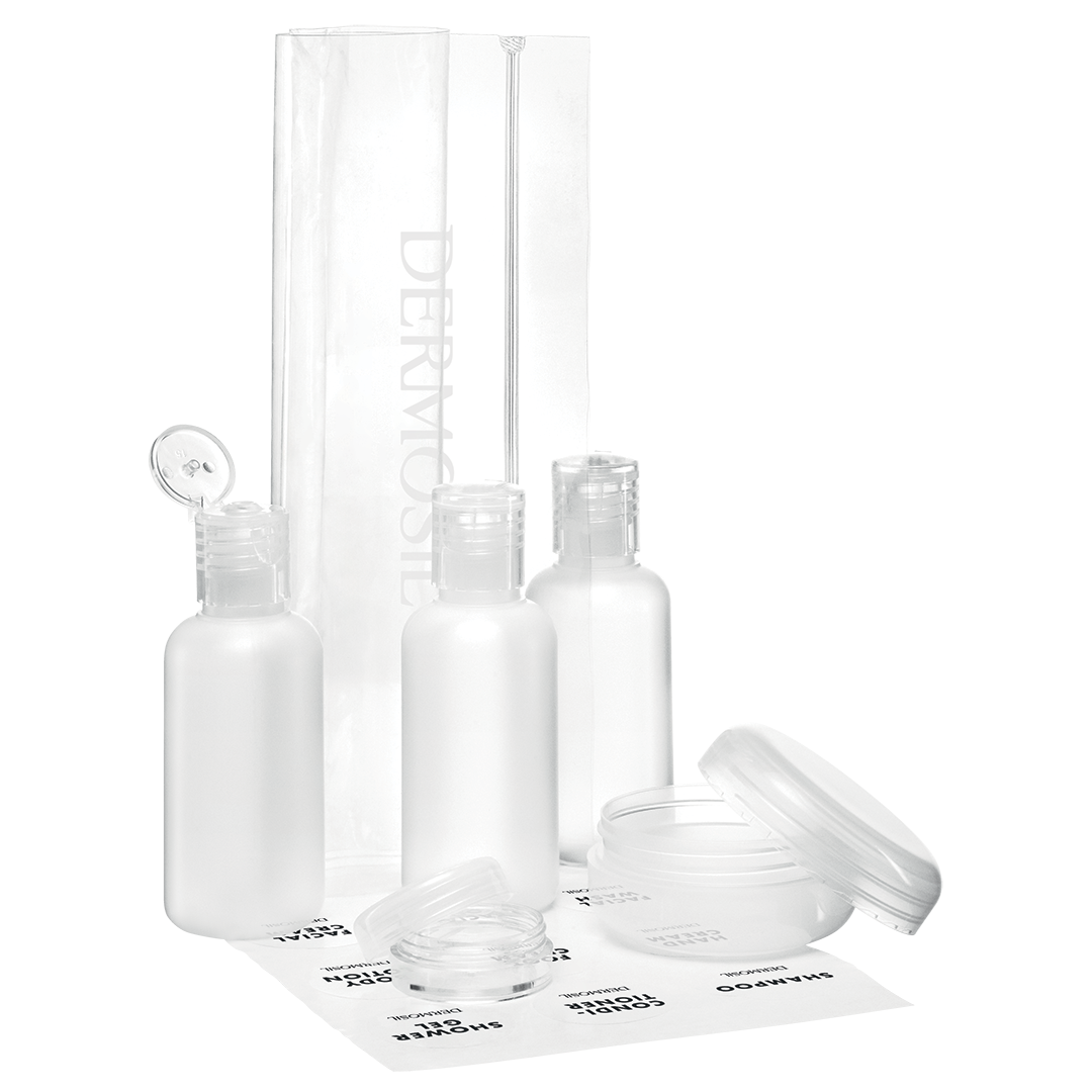 Komplekti kuulub kolm 60 ml flip-korgiga tühja reisipudelit ja kaks keeratava korgiga varustatud reisipurki. Suurema reisipurgi maht on 35 ml ja see sobib näiteks kehakreemidele. Väiksema reisipurgi maht on 5 ml ja see sobib näiteks näokreemidele või tablettide hoidmiseks. Komplekti kuulub veel taassuletav kilekott mõõtmetega u 21 x 21 cm. Kilekoti mõõtmed on sobivad lennuki käsipagasi jaoks.