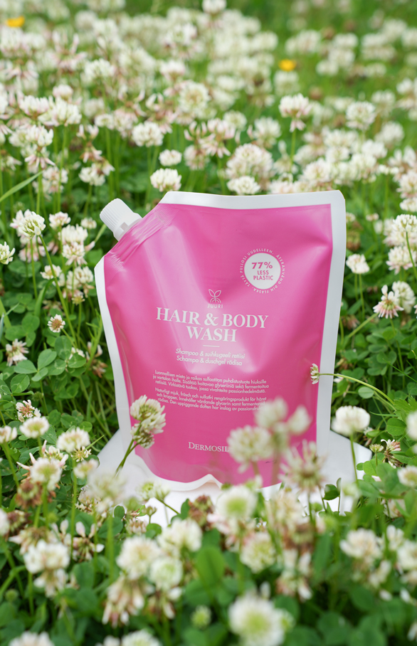 Täitepakend on valmistatud PET/PA/PE plastikust ning kork on PP plastikust. Täitepakend säästab märkimisväärselt plastikut ja võtab prügikastis vähem ruumi. Dermosili täitepakend on keskkonnasõbralik valik.