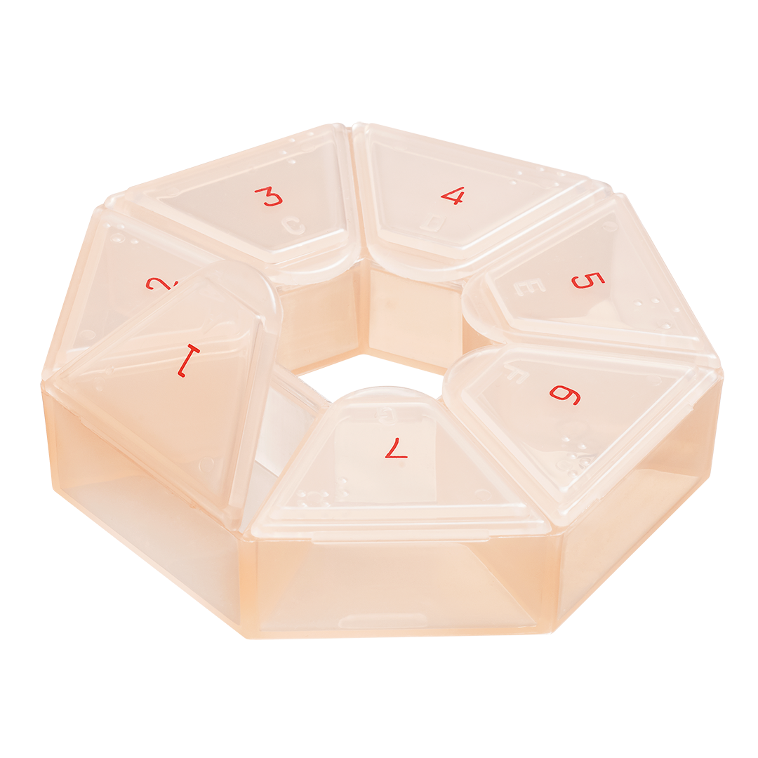 Ümmarguse dosaatorikarbi igal sahtlil on eraldi kindel kaas, mis tagab, et sahtlid kogemata ei avaneks. Ühte sahtlisse mahuvad kõik selle päeva vitamiinid. Vitamiinikarp sobib ka ravimidosaatoriks.