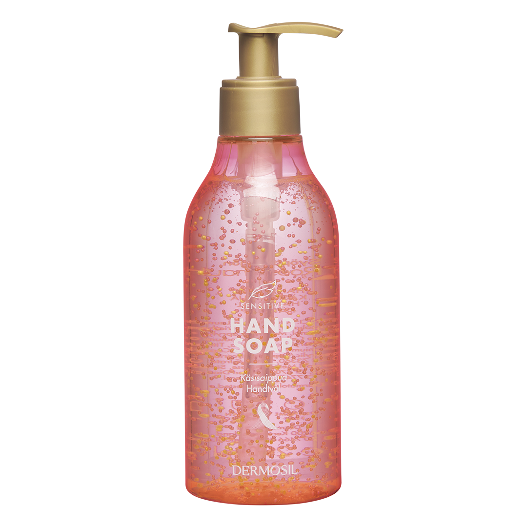 Ilusasse pudelisse pakendatud leebe Sensitive Käteseep Roosa lint sisaldab kauneid väikesi pärleid, mis käsi pestes lagunevad. Toote ostmisega toetad Roosa lindi 2024. aasta kampaaniat.