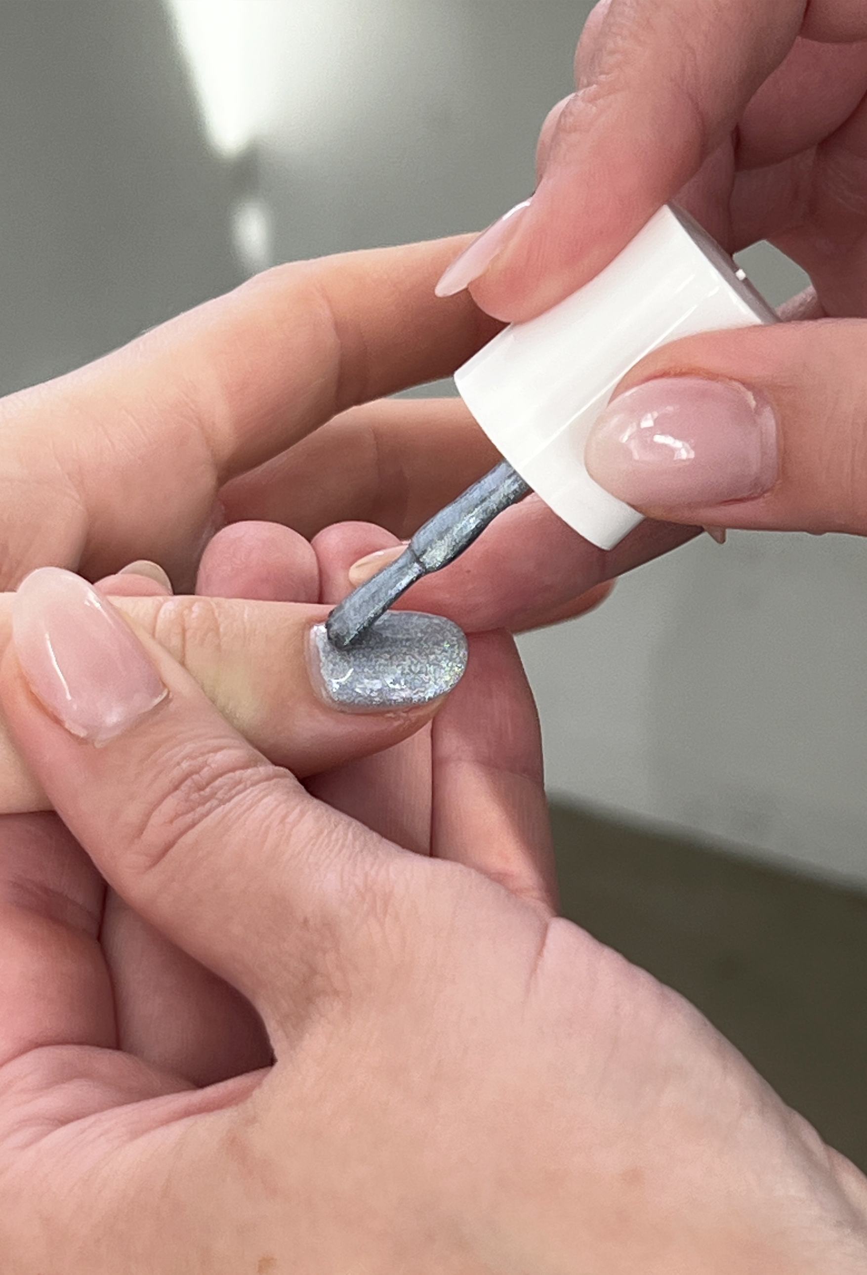 Jahe sinine küünelakk õrna holograafilise efektiga. Vegan, lõhnavaba ja kiirelt kuivav.