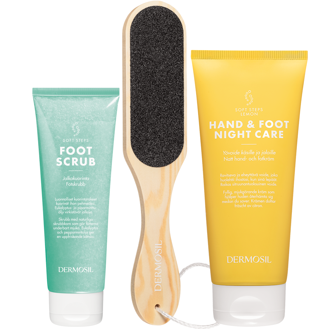 Komplekt Pehmed jalad sisaldab kolme luksuslikku ja tõhusat toodet, et jalad oleksid hooldatud ja pehmed.