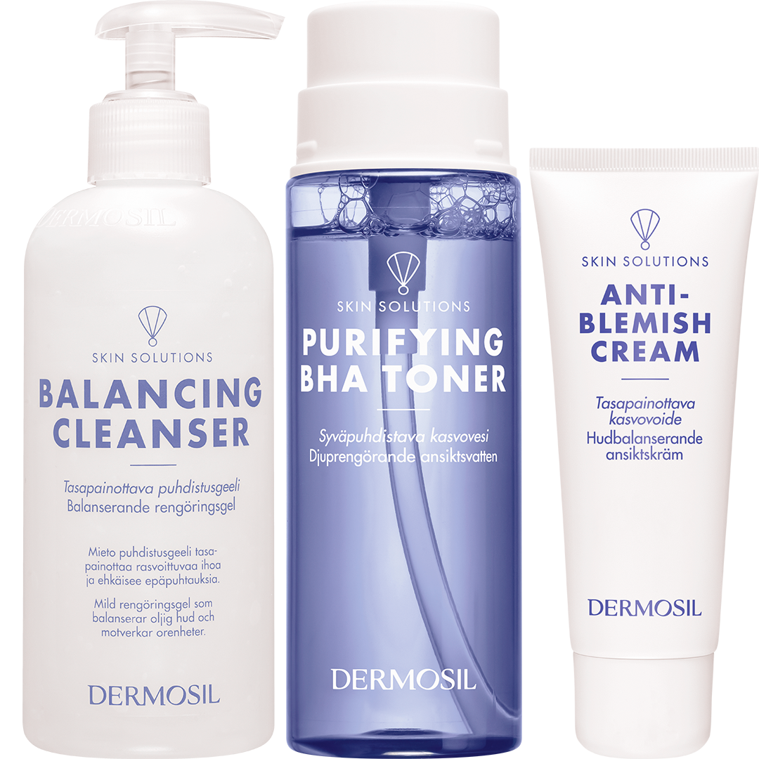 Skin Solutions Tasakaalustav näohoolduskomplekt sisaldab kolme tõhusat toodet, mis aitavad hoolitseda rasuse naha ning ebapuhta naha eest, millel kipuvad kergesti tekkima vistrikud ja komedoonid. Parima tulemuse saad, kui kasutad Tasakaalustavat puhastusgeeli, Sügavpuhastavat näovett ja Tasakaalustavat näokreemi koos.
