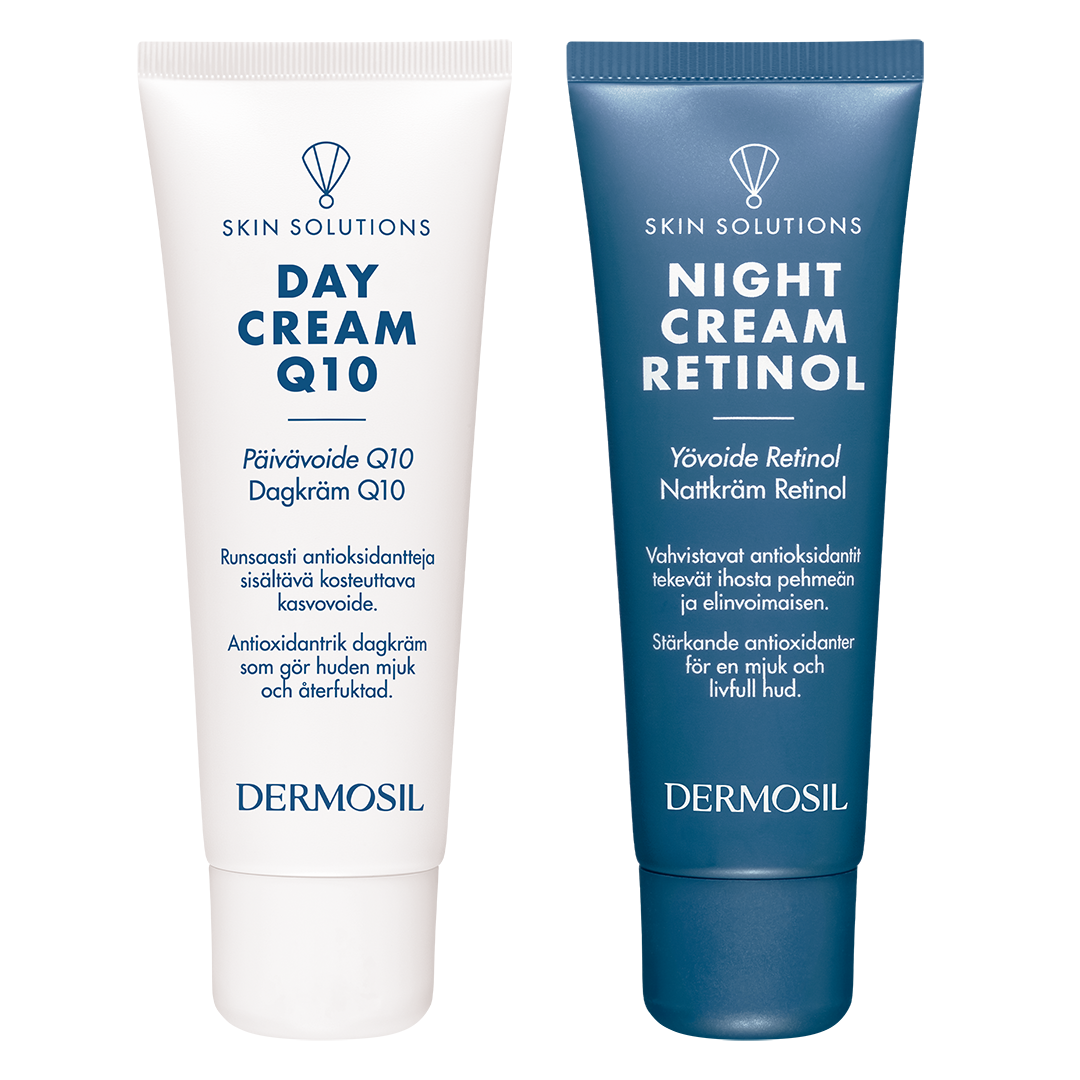 Komplekti kuulub kaks populaarset toodet sarjast Skin Solutions: Päevakreem Q10 ja Öökreem Retinol. Rikkalikult antioksüdante sisaldav niisutav päevakreem kindlustab naha heaolu ja aitab ennetada naha vananemise ilminguid. Retinoolikreem sobib ideaalselt öökreemiks, sest see niisutab ja aitab ennetada naha vananemisilminguid.